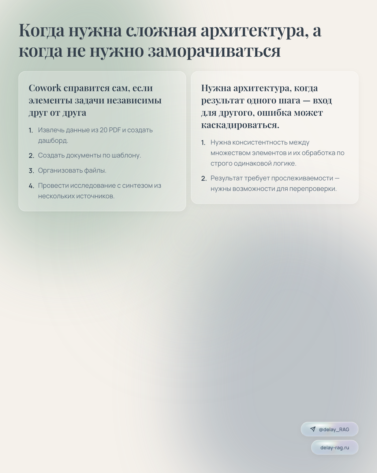 Эх, вот бы в гайдах от Anthropic, коих уже целая куча, появится материал, который бы честно разводил use-cases по уровню сложности и подсвечивал, где нужна архитектура процесса, т.к. дефолтные настройки не предназначены для этого… этот пост всё равно бы появился!) А если я ошиблась, и такой материал есть, скиньте мне, пожалуйста. От лирического предлагаю вернуться к практическому.